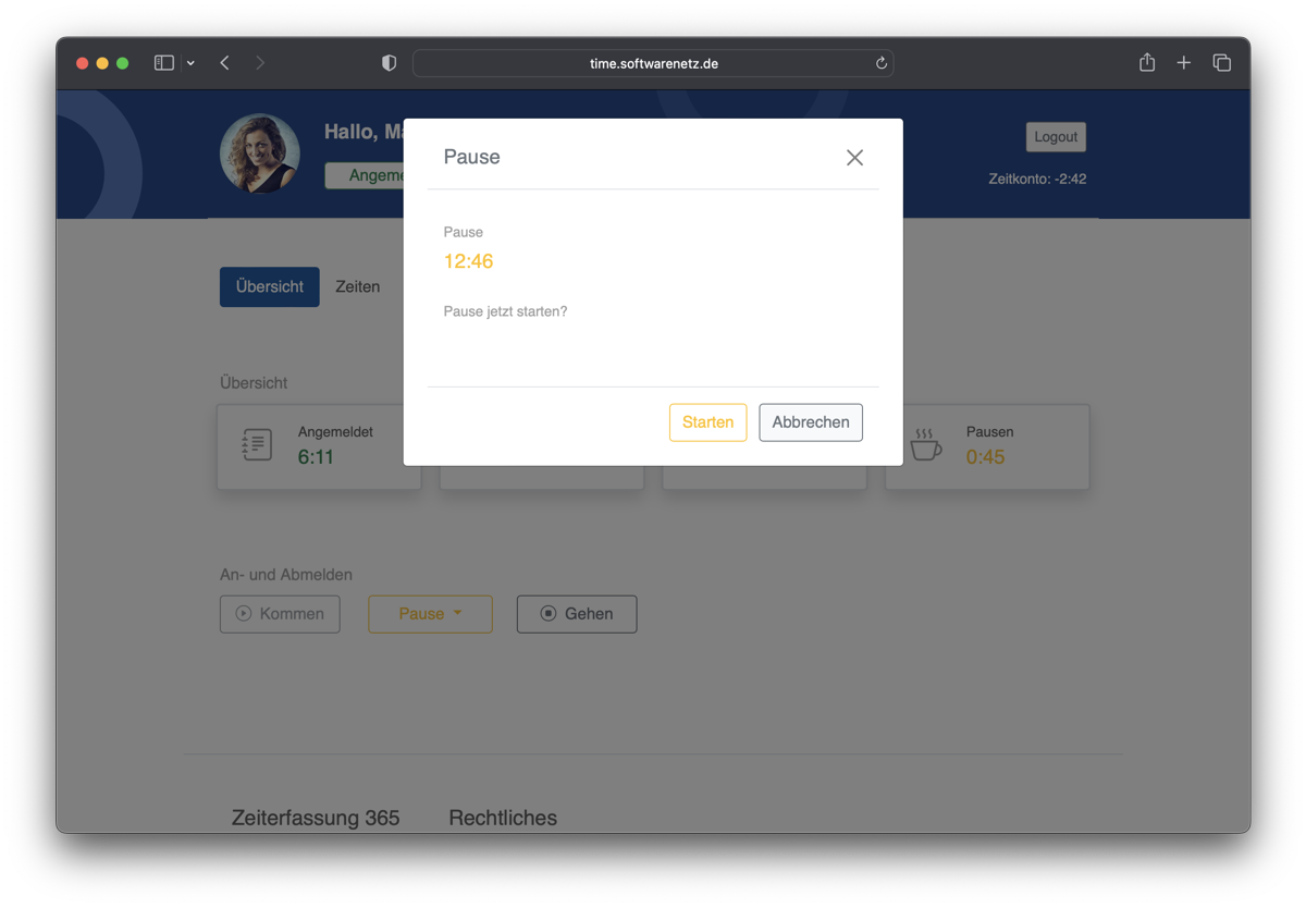 z.B. im Büro am Terminal anmelden, die Pause über die Web-App starten und anschliessend mit der Handy-App