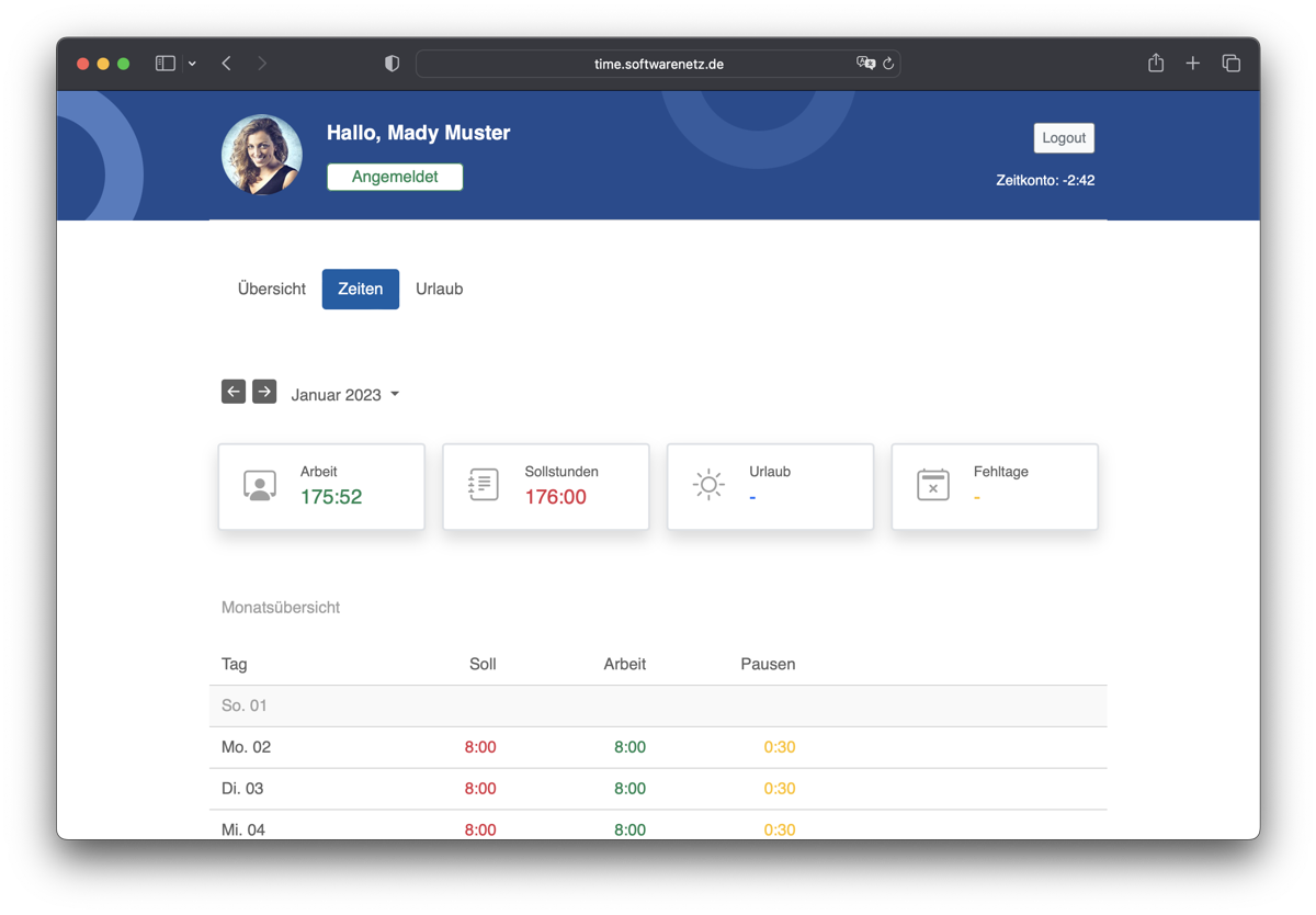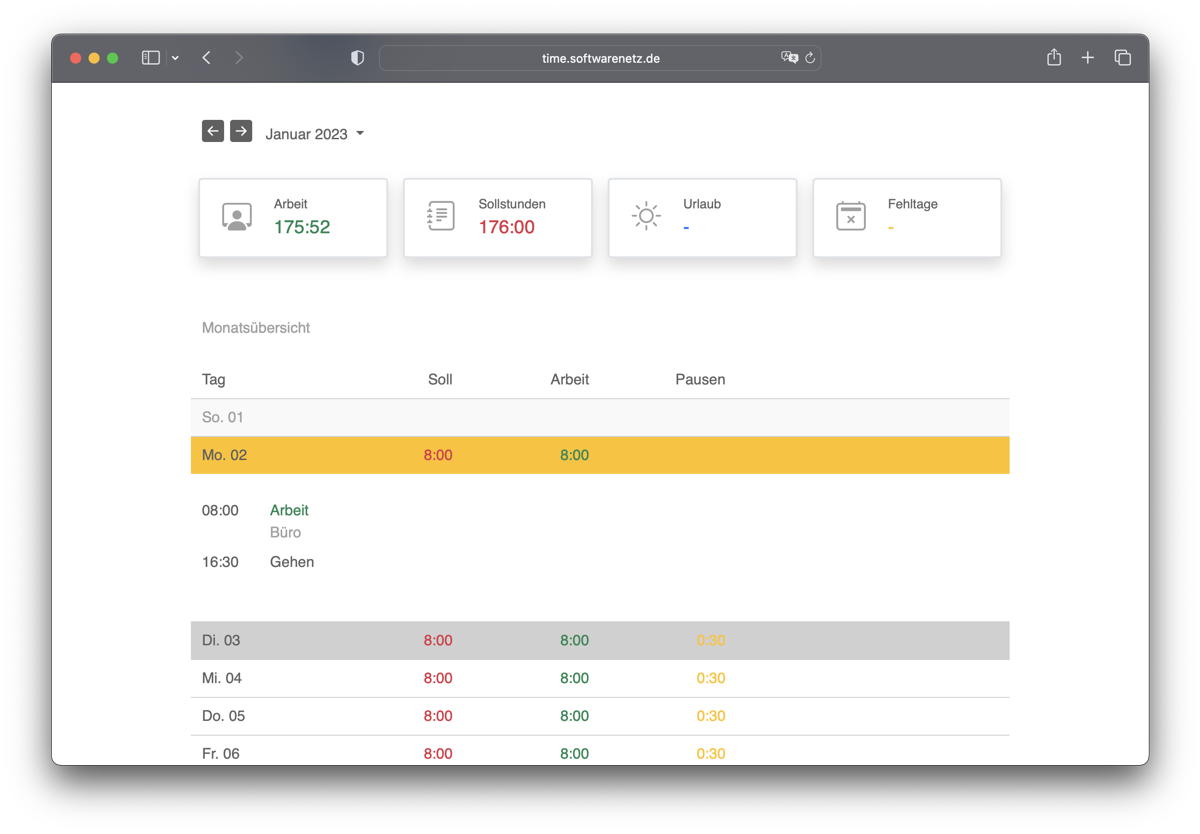 In der Monatsübersicht sieht dein Mitarbeiter seine eigenen Soll- und Arbeitsstunden je Arbeitstag.