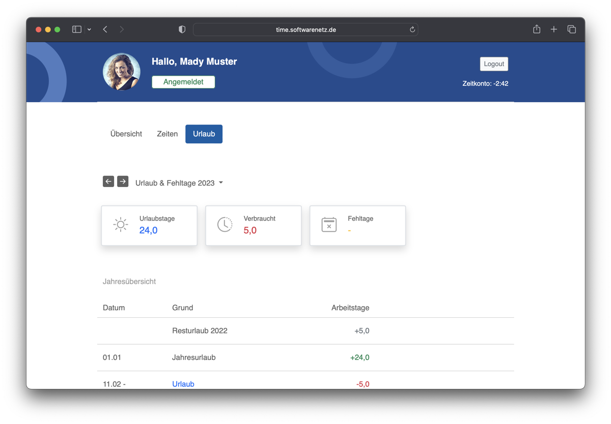 Falls noch Urlaubstage vom Vorjahr übertragen wurden, werden diese ebenfalls angezeigt und zusammen mit