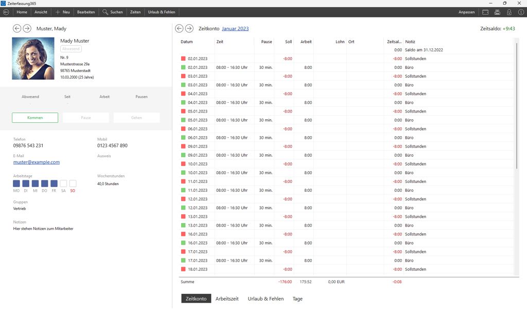 Nachdem Sie Ihre Mitarbeiter eingetragen haben, sehen Sie auf der linken Bildschirmseite alle wichtigen Daten zum Mitarbeiter, auf der rechten Seite können Sie unter verschiedenen Ansichten wählen: