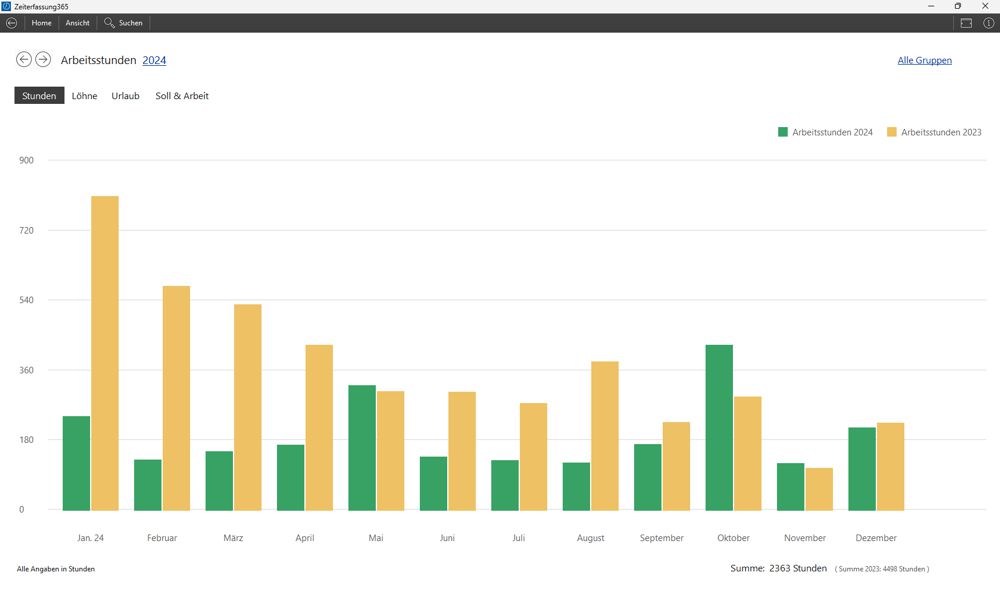 In den Statistiken werden monatliche Arbeitszeiten, Löhne, Urlaub- & Fehltage, sowie Soll- im Vergleich zu Arbeitsstunden als Balkengrafik dargestellt.